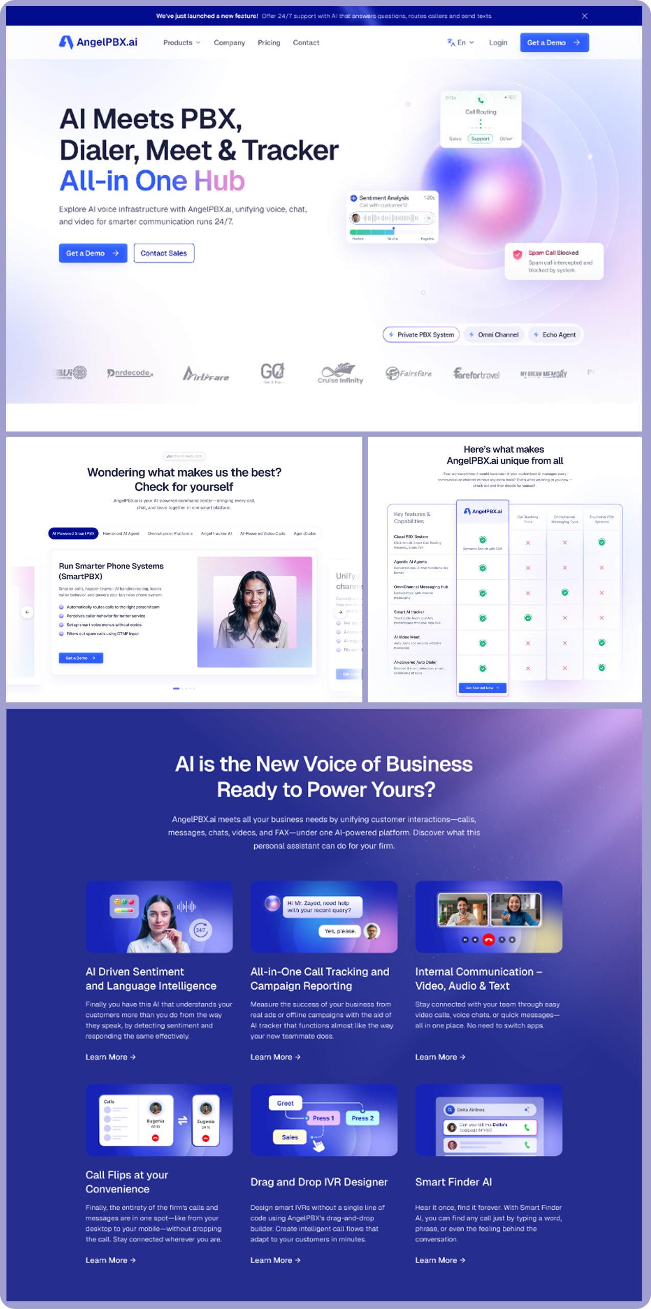 - Use of icon-led cards to explain complex features like SmartDial AI, OmniChannel, and AngelTracker