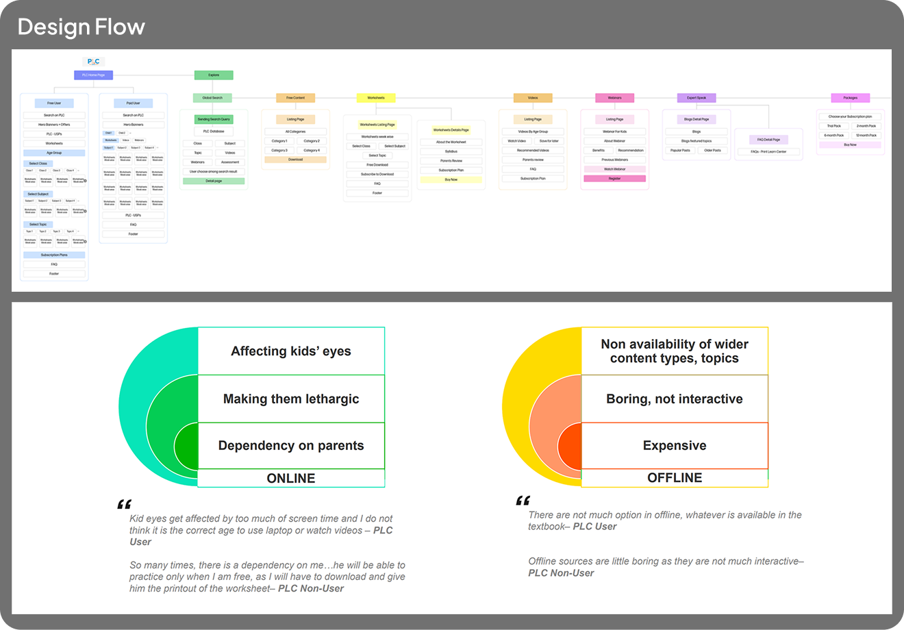 Print Learn Center (PLC) is a parent-facing platform offering printable foundational learning materials for children aged 3–12. However, it lacked clarity in purpose, faced weak brand recall, and suffered from poor mobile usability, despite 90% of its traffic coming from mobile users.Parents often couldn’t identify PLC as a source for worksheets, confusing it with ed-tech brands like BYJU’S. Weak SEO messaging and friction-heavy navigation pushed them to look elsewhere, undermining engagement and brand stickiness.